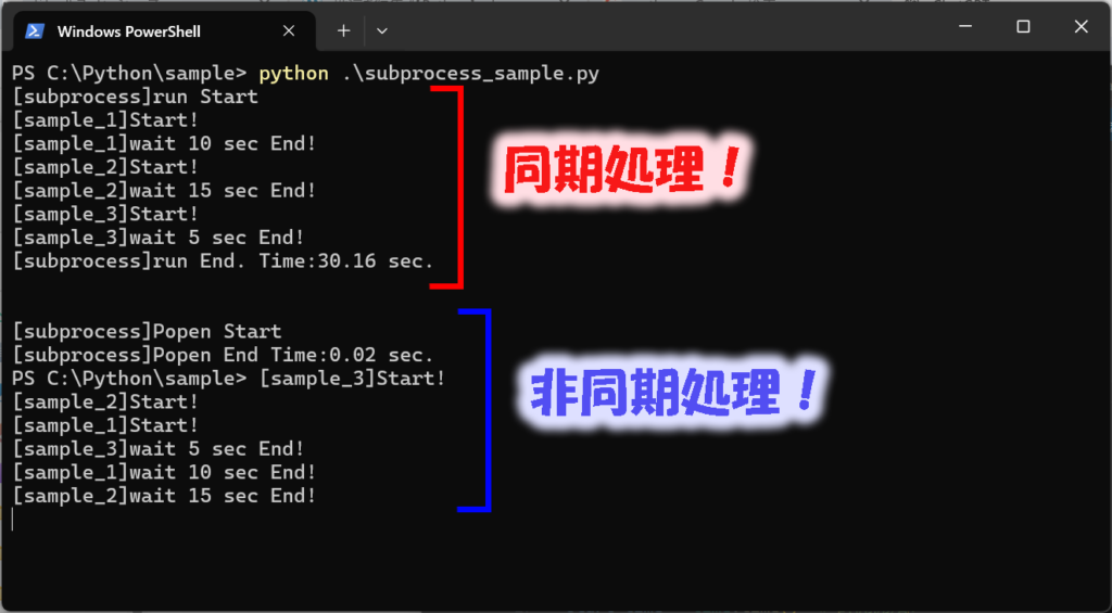 同期処理(subprocess.run)と比較することで、違いをはっきりと理解していきましょう!
